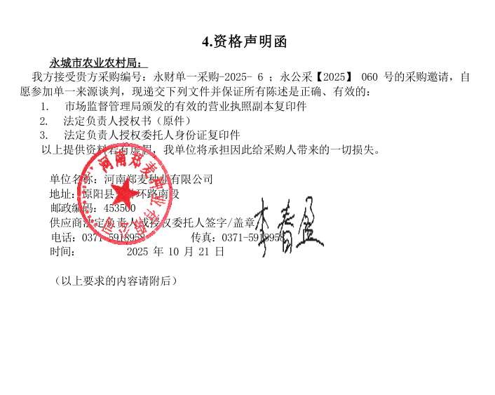 | 因种子是特殊商品,受品种的种权保护,小麦种子郑麦1860在永城市区域内只有唯一的供应商,经专家论证,可以采取单一来源采购。 | |||||||||||||||||||||||||||||||