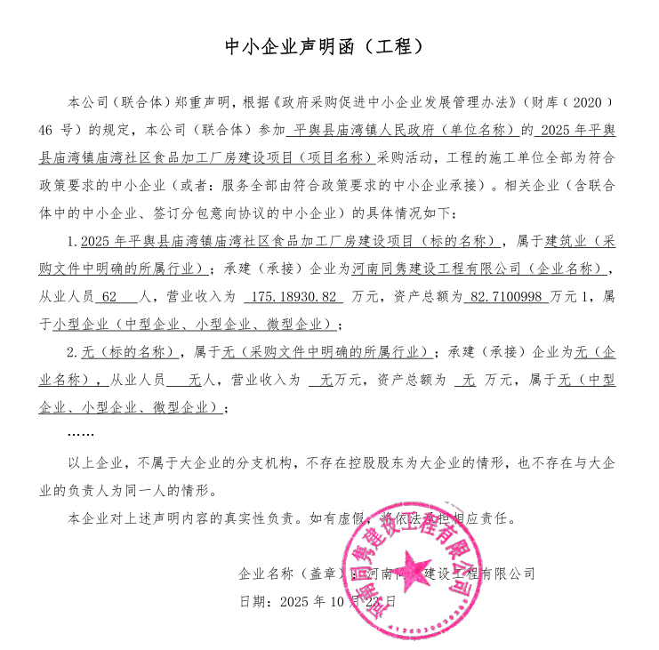 平舆县庙湾镇人民政府2025年平舆县庙湾镇庙湾社区食品加工厂房建设项目-成交公告