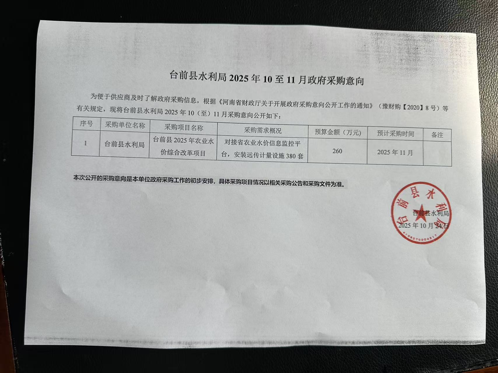 为便于供应商及时了解政府采购信息,根据《******水利局 2025年10(至)11月采购意向公开如下: |