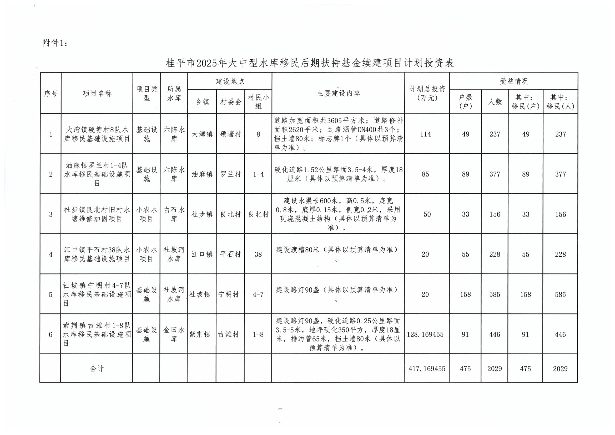 | 1 | 桂平市2025年大中型水库移民后期扶持基金续建项目 | 达到合格验收要求 | 417.2 | 2025年11月 | 扶持中小企业发展或者非面向中小企业 |
