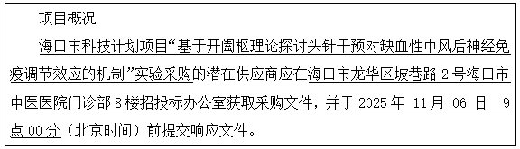 项目名称:海口市科技计划项目“基于开阖枢理论探讨头针干预对缺血性中风后神经免疫调节效应的机制”实验采购